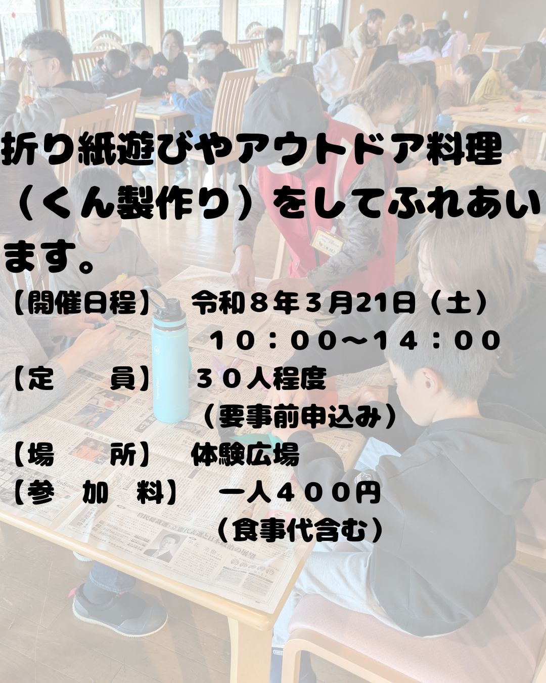 3月21日にどんぐりイベントを開催します!折り紙遊びやアウトドア料理(くん製作り予定)をしてふれあいましょう。