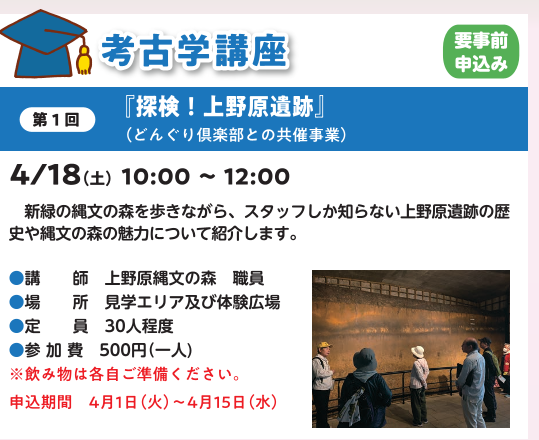 4月18日(土)に考古学講座&どんぐりイベント「探検!上野原遺跡」を開催します。