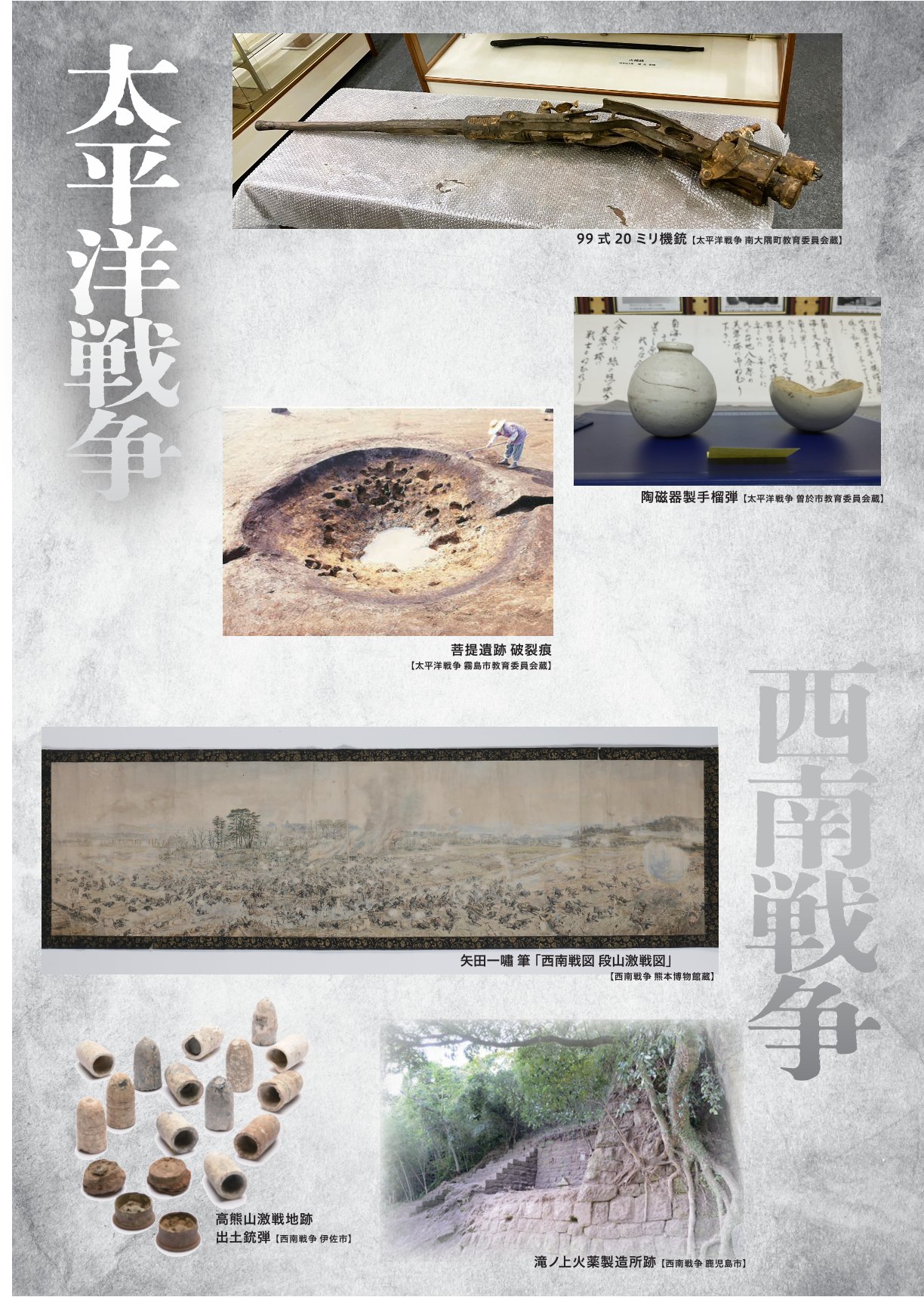 今回の企画展では,太平洋戦争や西南戦争などの戦跡・遺物を中心に, 弥生時代・古墳時代の武具系の遺物などの発掘調査成果も展示し,各時代のたたかいについて考える企画展です。