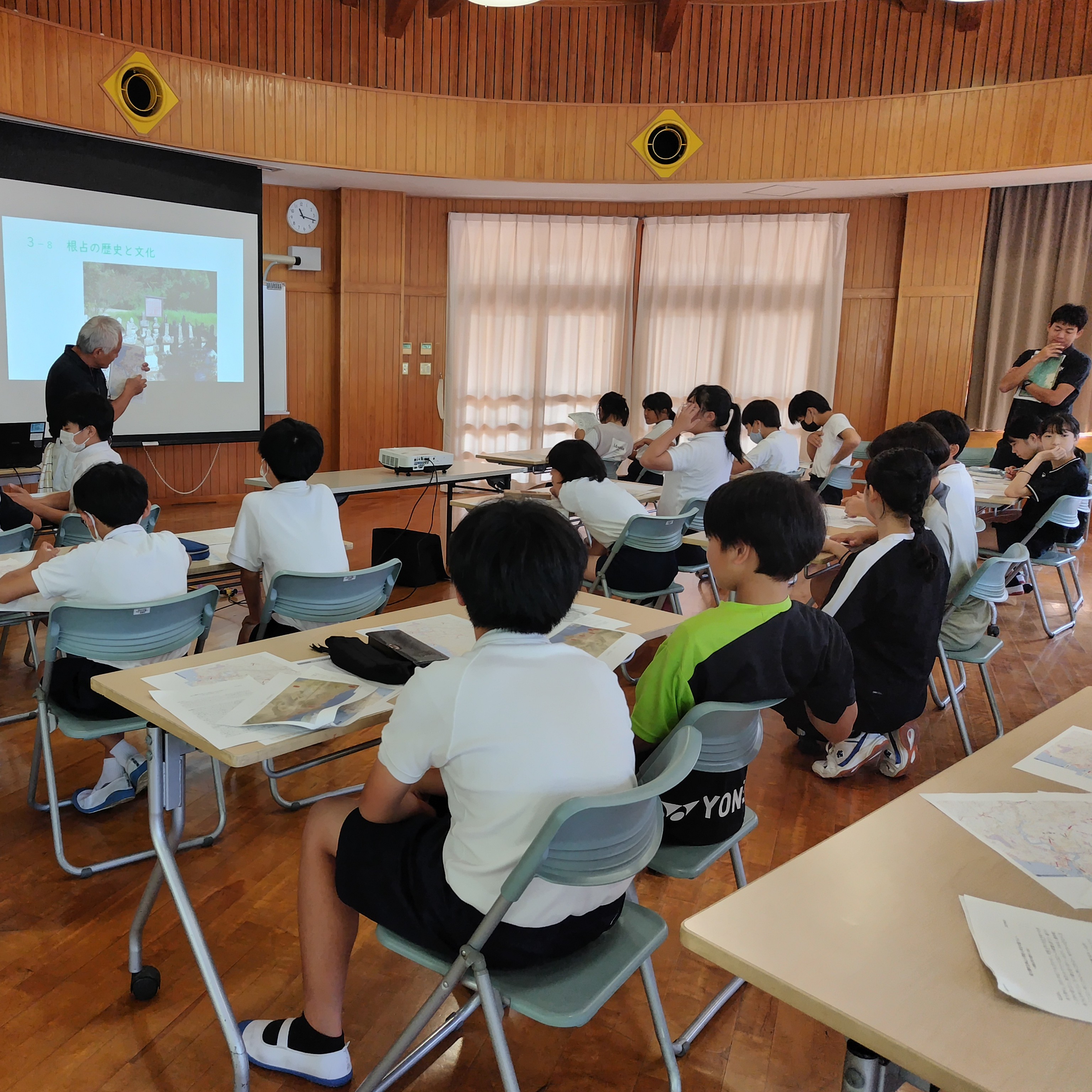 授業では,南大隅町根占の歴史について,近現代から時代を遡り,古代まで学習しました。事前にワークシートを配布し,郷土の歴史を自分で調べたり家族に聞いたりしながら調べてもらっていたので,授業で答え合わせができました。地図を見て知っている場所が出てくると,頷きながら確認する子ども達もいました。