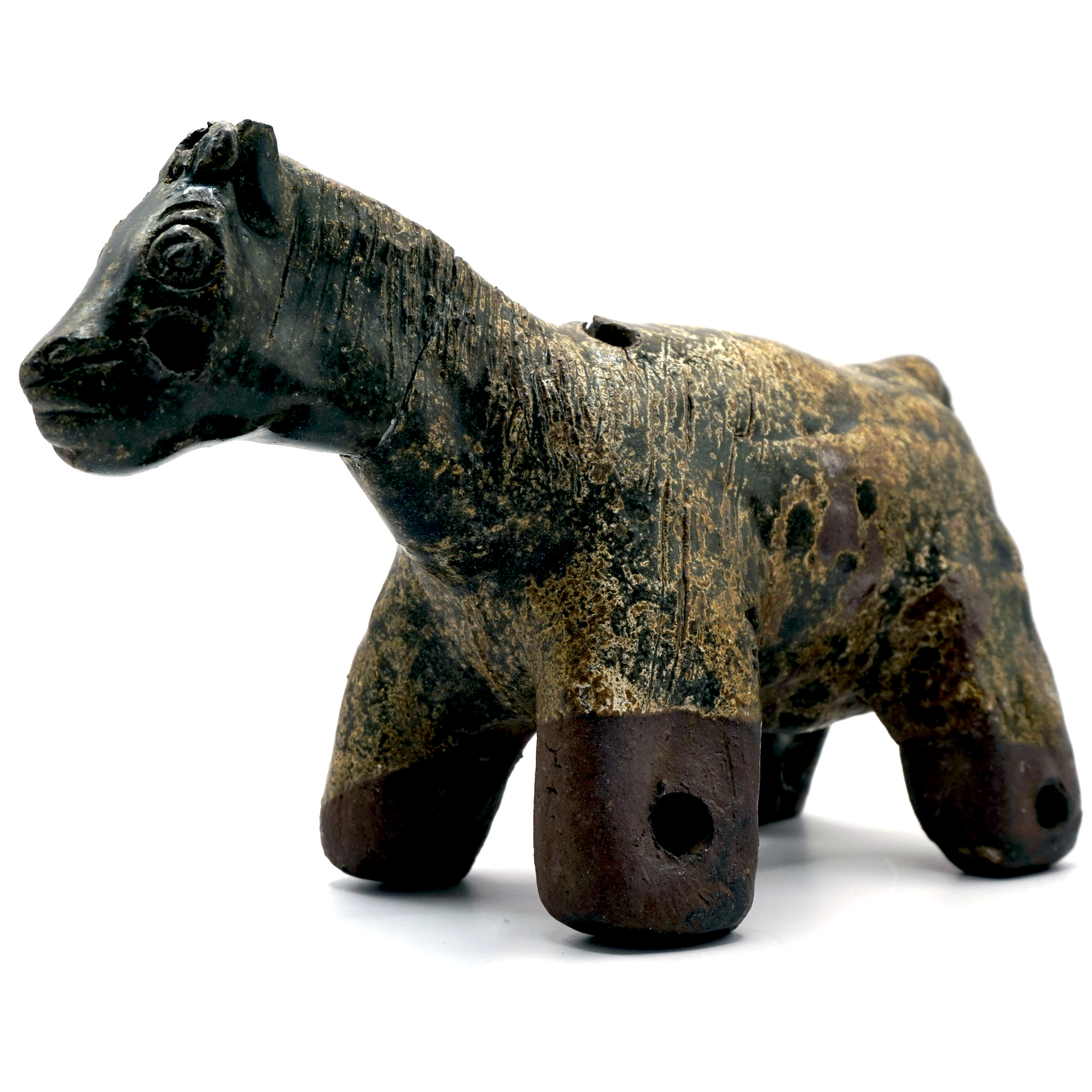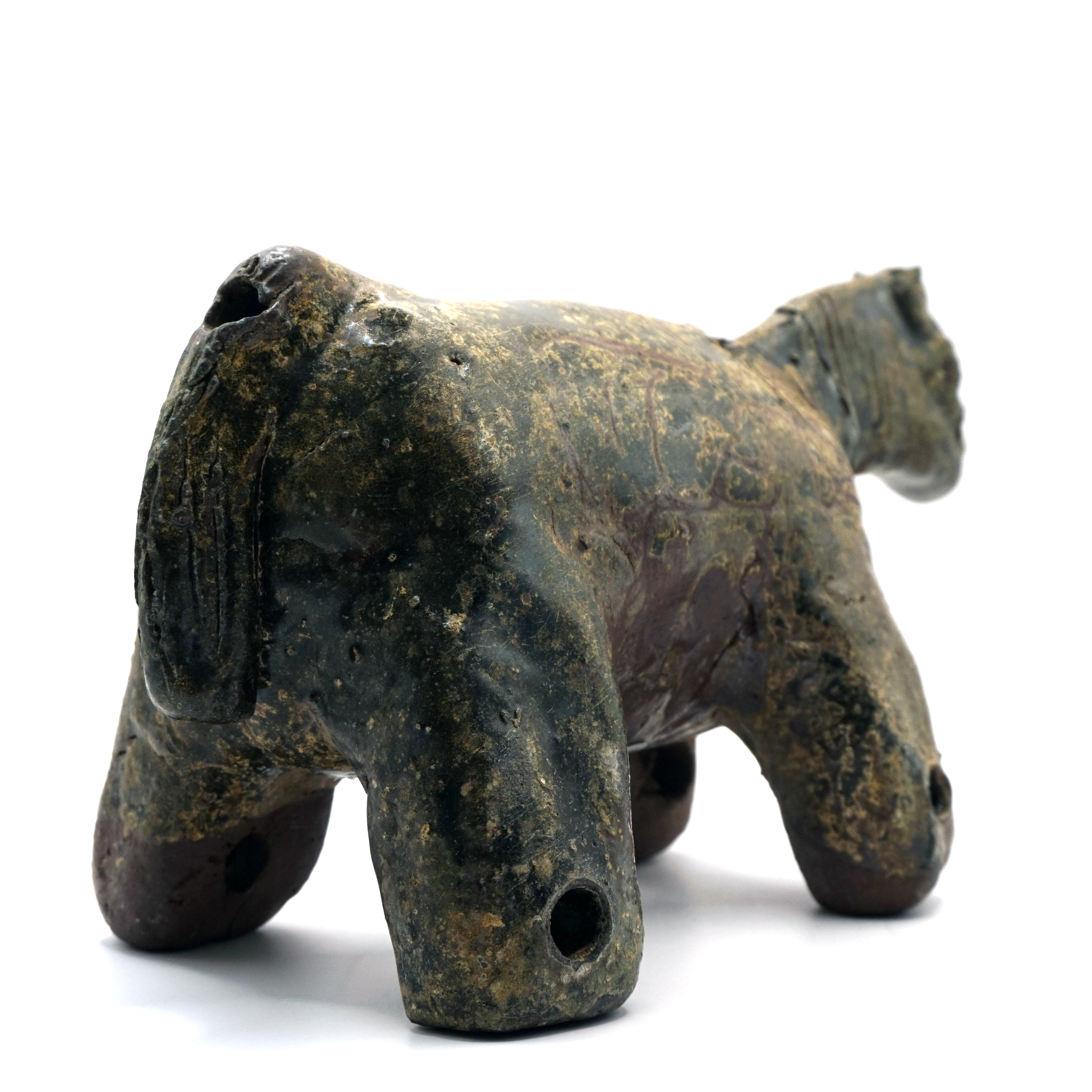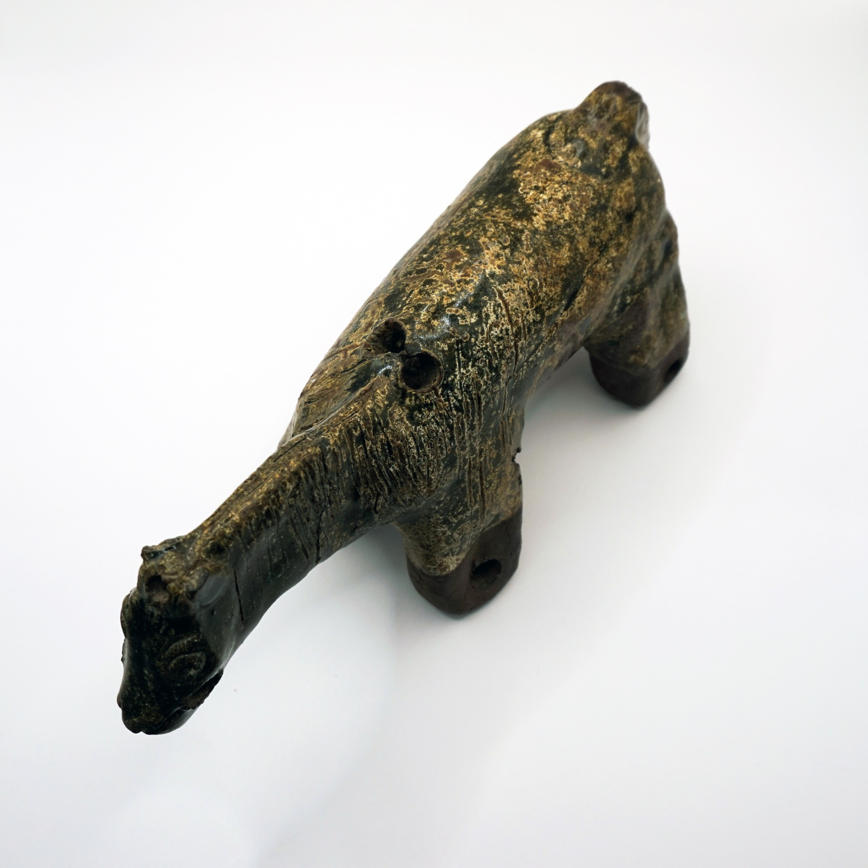 陶製の馬です。足の先端以外は緑褐色の釉薬(ゆうやく)がかけれています。鬣(たてがみ)が詳細に表現されているほか,背中側の首付近と尾っぽ付近,足の先端に円形の穴があけられています。