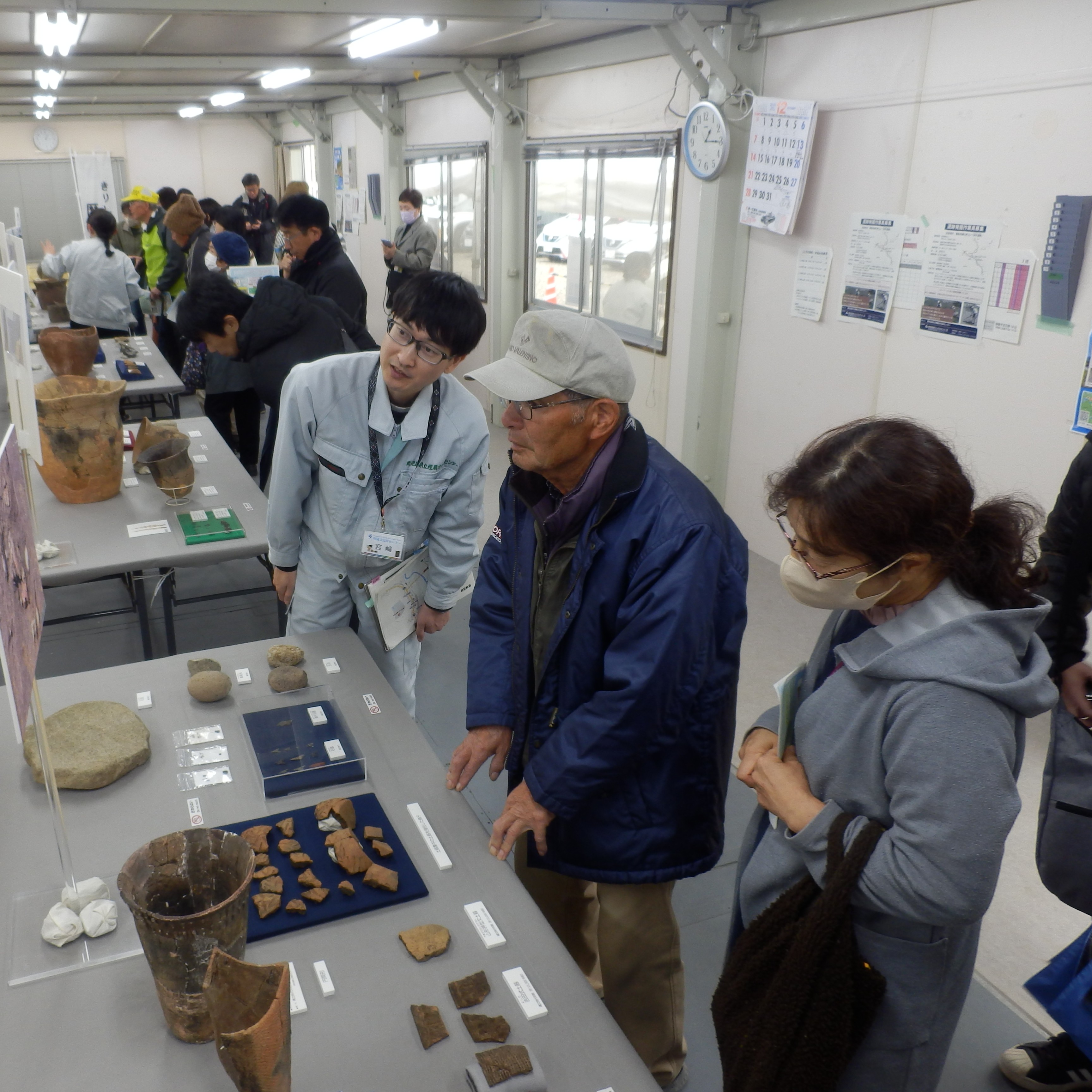 参加された方々は,担当職員から発掘調査の成果について説明を受けながら,出土した遺物や遺物を興味深くご覧になられていました。