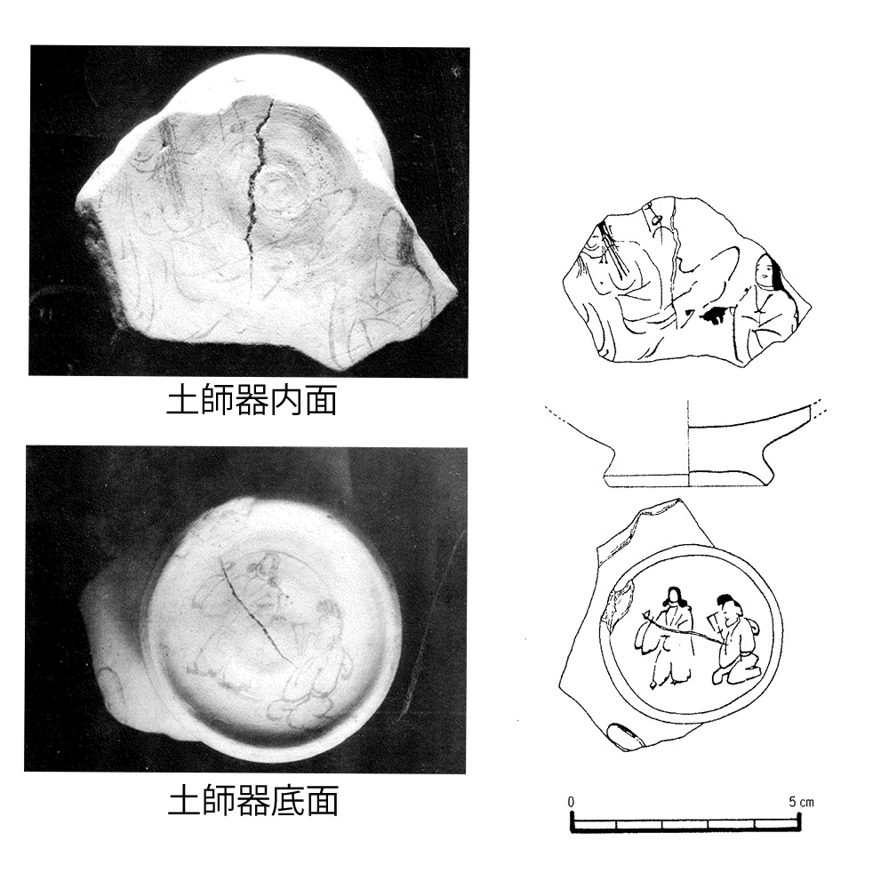 薩摩国府跡で出土した墨書戯画土器は,瓦が集積された中から出土したもので,土師器の底部の内外面に墨書きで絵や文字が描かれていました。
