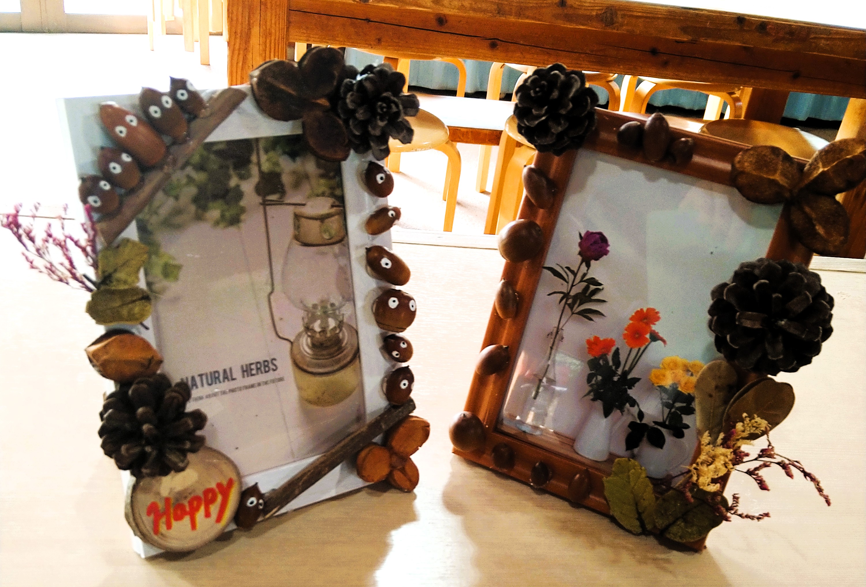 森でとれたドングリや木の実をたっぷりと使って、はがきや写真を飾る自分だけのフォトフレームを作ろう!