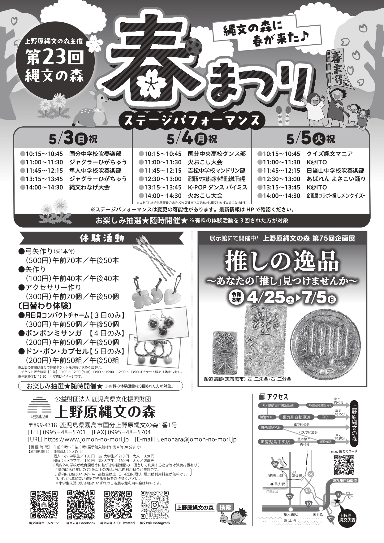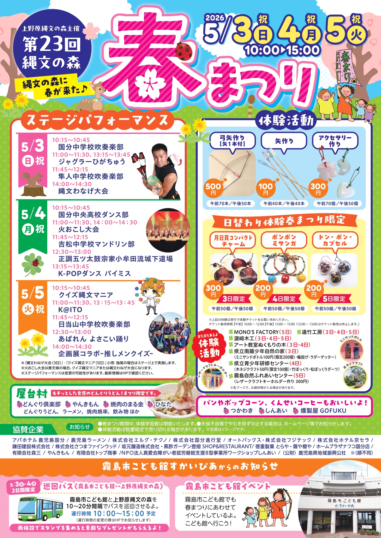 まつり限定の体験活動,楽しいステージパフォーマンス,おいしくて人気のどんぐりうどん,ゴールデンウィークは,上野原縄文の森へぜひお越しください!!